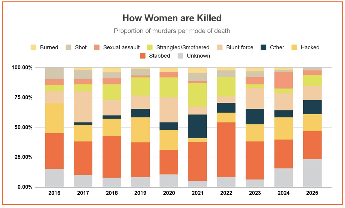 The majority of women are killed through direct physical force, most notably by stabbing. This method requires a level of closeness that points to intimate, face-to-face violence.