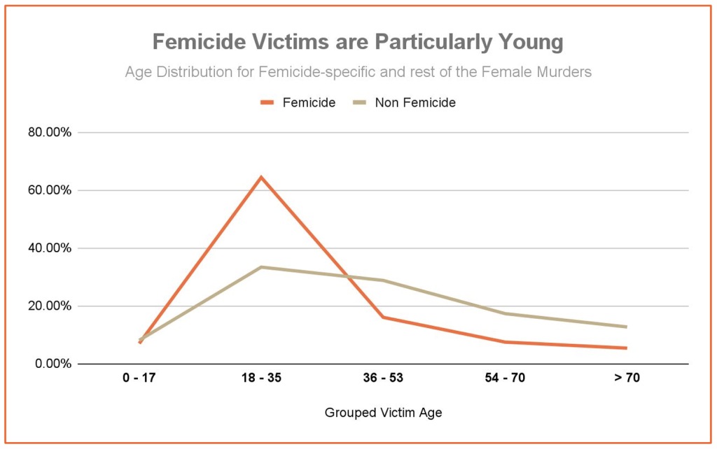 The most common age of victims continues to cluster in the mid-twenties. Victims aged 36–53 declined compared to earlier years, while cases involving children and older women remained consistently lower. This pattern differs sharply from non–gender-related murders, where deaths are more evenly distributed across age groups. The data underscores that femicide is not randomly spread across the life course: it is a form of violence that targets young women, with age itself acting as a key risk factor.