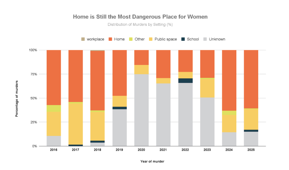 When cases with unknown locations are removed, the data shows two clear and troubling trends. The home remains the primary site of femicide, but violence in public spaces has also risen over time, signalling a broader erosion of safety for women beyond private settings.