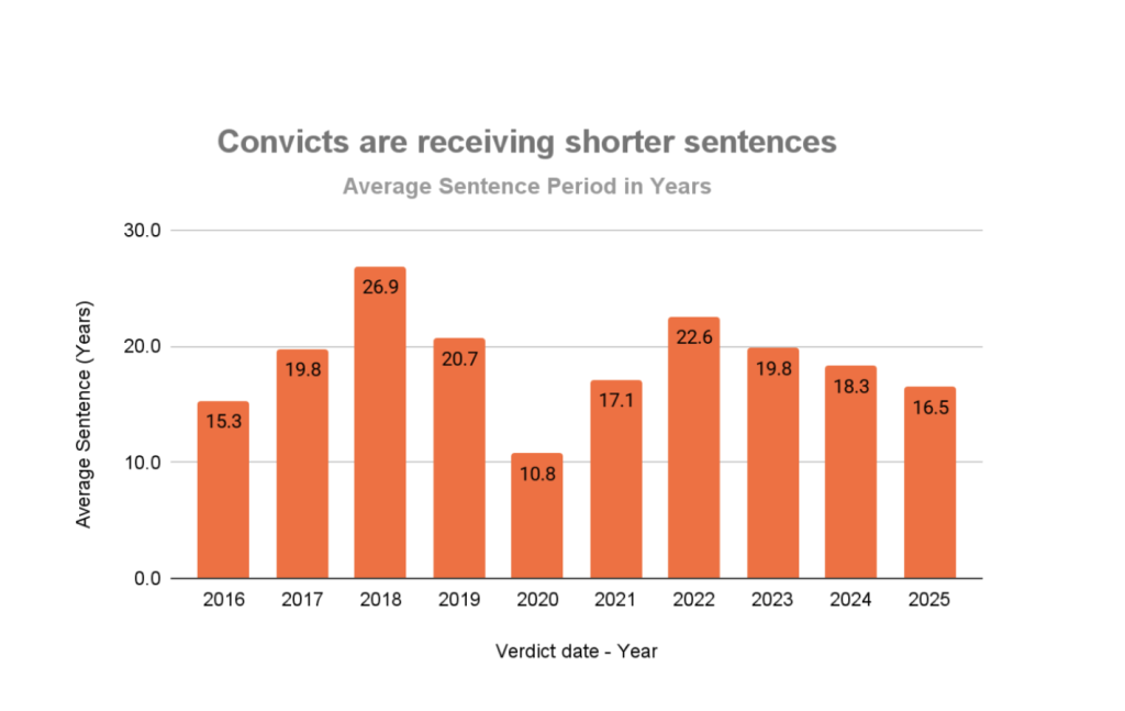 Sentencing data over the past decade shows a clear trend in how courts punish femicide-related convictions. The longest average sentences were handed down in 2018, when prison terms peaked at just under 27 years. Since then, sentencing lengths have fluctuated but have trended downward in recent years. From 2022 onward, the average sentence has declined by roughly two years annually, reaching an average of 16.5 years in 2025.