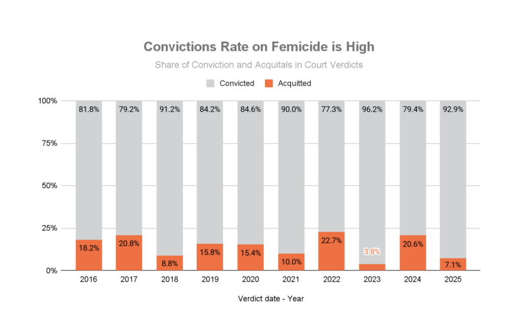In 2025, 93% of at least 84 cases concluded during the year resulted in convictions. Despite slow and painful court processes, convictions in femicide cases remain high.