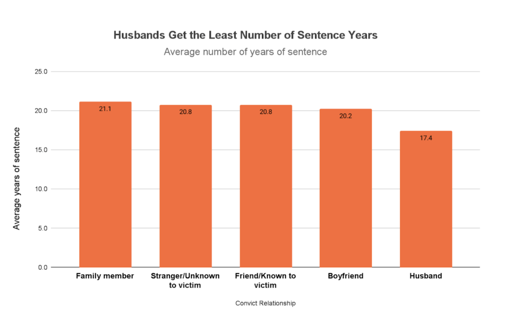 Husbands are more likely to be convicted of manslaughter, resulting in shorter sentences, an average of 17 years, compared to other family members, who receive an average of 21 years. Courts make these determinations based on plea bargains, often citing spur-of-the-moment fights and the need for the accused to care for children left behind.