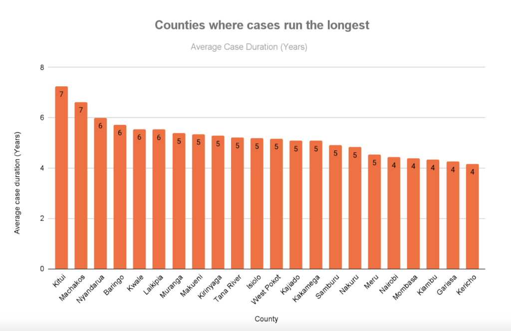 The time it takes for femicide cases to reach a verdict varies sharply by county, revealing deep geographic inequalities in access to justice. In Kitui and Machakos, families wait an average of seven years for a court decision. In Nyandarua, Baringo, Kwale, and Laikipia, cases take about six years to conclude. Even in counties with comparatively faster outcomes, including Nairobi, Mombasa, Kiambu, Garissa, and Kericho, families still wait an average of four years.
