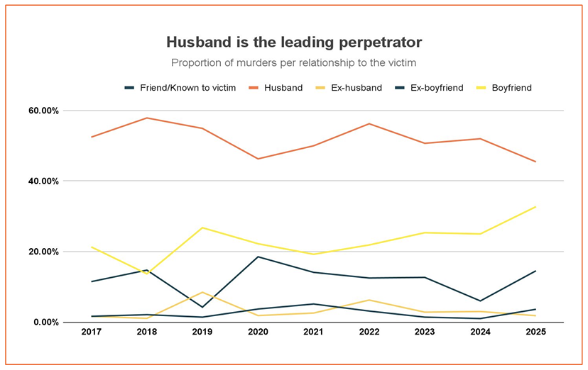 Across the years, one line remains consistently high: Intimate Partners. From 2017 to 2025, they account for the largest proportion of murders, hovering between nearly half and well over half of all cases. The data shows that marriage, for many, does not shield women from harm; instead, it too often places them directly in its path.